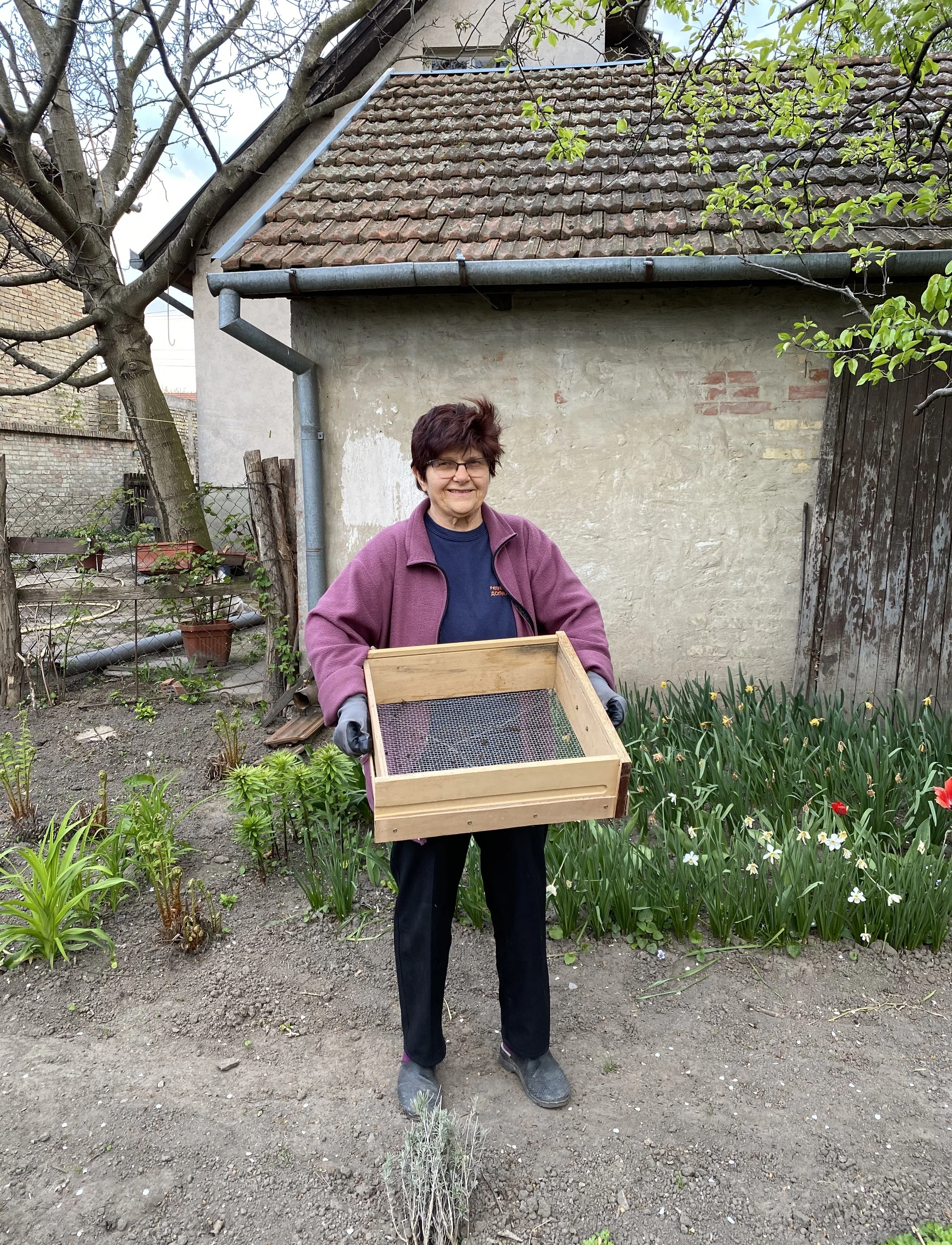 To efficiently separate the compost from the plastic, we built a tool using old scraps we gathered from her home. By using an old drawer, a metal mesh, and some other tools, we built a sifter. We added the handle of another drawer to make it easier to hold and use our tool. The sifter helps sift through the mixture, allowing the compost to fall through and be usable as an additive to the garden’s soil while retaining the plastic for proper disposal.